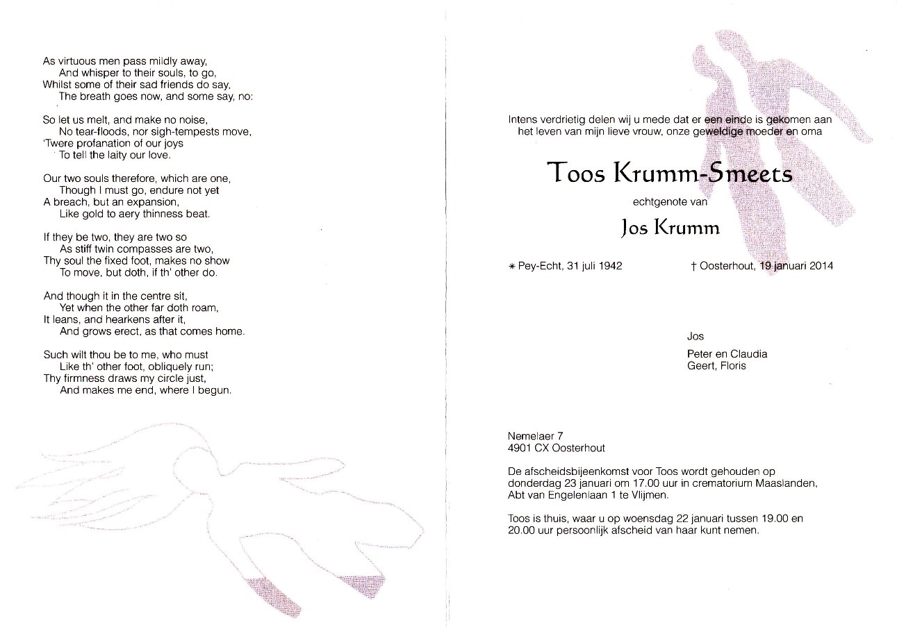 Toos is een zus van Pater Theo Smeets en van Graadje, Jan en Perry. Woonde op de Schoolstraat.